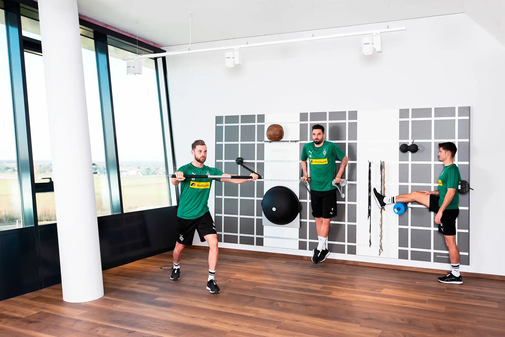 WONDERWALL wird einfach an einer geeigneten Trägerwand montiert. Mit Hilfe des rasterförmigen Schienensystems können Geräte wie drehbare BLACKROLLs, Massage-Tools Klimmzugstangen oder Schlingentrainer mit einem Handgriff befestigt und am Raster entlang verschoben werden. So lassen sich auch kleine Räume hocheffizient ausnutzen – egal ob Fitnessstudio, Physiopraxis, Hotelzimmer oder bei dir zu Hause.